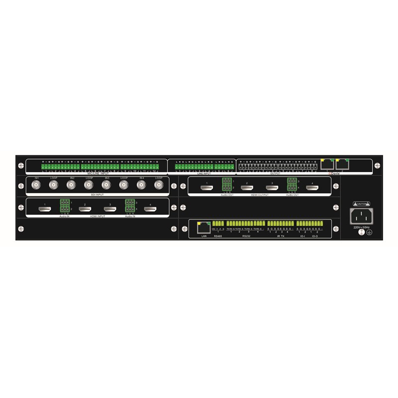 主机采用19"标准单一机箱,≤2.5U高度;插卡式机箱,可扩展VGA、HDBaseT、光纤、HDMI、3G-SDI、DVI-I扩展板卡;